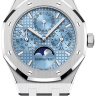Изысканные женские часы от Audemars Piguet являются образцами классического стиля. Завершенные линии, гармоничное сочетание мельчайших деталей, высококачественные материалы и ярко выраженная индивидуальность каждой модели привлекают истинных поклонников имиджевых аксессуаров. Часы выполнены в корпусе из нержавеющей стали размером 38 мм. Толщина корпуса составляет 9,4 мм. Механизм с автоматическим подзаводом работает от амплитуды движения руки. Часы с водонепроницаемостью 30 м перенесут небольшое случайное попадание воды. Циферблат закрыт прозрачным антибликовым стеклом из сапфирового хрусталя высокой прочности, благодаря чему обеспечивается максимальная защита от сколов и механических повреждений. Модель поставляется на стальном браслете с раскладывающейся стальной застежкой. Вечный календарь. Фазы луны. Калибр 7136. Запас хода до 55 часов. Циферблат голубой. Задняя крышка с сапфировым стеклом.Гарантия и комплектация