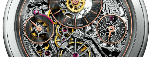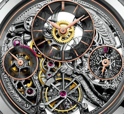 Ручная гравировка по металлу, украсившая поверхности открытого механизма сыграла ключевую роль в дизайне новых моделей Audemar Piguet Jules Audemars Tourbillon Openworked. Наличие турбийона, широкое применение ручных техник декорирования — все это автоматически относит часы к категории ультра-дорогих. Материалом 41-миллиметрового корпуса новики выступила платина 950 пробы. На поверхности скелетонизированного циферблата установлены три кольцевые индикатора, выполненные из розового 18-каратного золота и отвечающие за показ времени и даты. Секундный счетчик, расположился в позиции «девятки», минутный и часовой — в самом верху по центру, а счетчик даты — в позиции традиционной «тройки». Механизм турбийона разместился в позиции «6». Скрытая от глаз заводная головка находится на своем традиционном месте — справой стороны корпуса.
