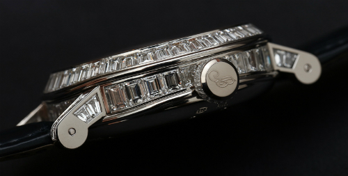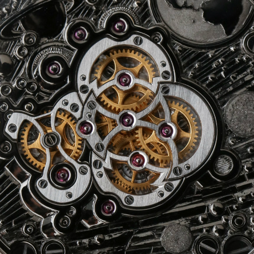 Первое что бросается в глаза при первом взгляде на аксессуар — это огромная заводная головка, габариты которой полностью соответствуют огромному 50-миллиметровому корпусу. Интересная текстурированная поверхность циферблата была воссоздана при помощи машинной гравировки, совмещенной с ручной техникой гильоширования, а насыщенный синий цвет реализован при помощи высокотехнологичной эмали, нанесенной вручную по технике Grand-feu. Синий циферблат и серовато-белая платина вместе создают замечательный контраст, который уместно дополнен сиянием драгоценных камней. Бриллианты багетной огранки в количестве 110 штук и общим весом в 30 карат, украсили внешний край корпусного кольца и тем самым подчеркнули роскошный облик премиального аксессуара. С обратной стороны часов на огромной опорной пластине механизма мастерами гравировщиками была воплощена фантастическая художественная композиция, имитирующая различные космические объекты на фоне ночного неба. В одном из таких небесных тел можно легко узнать и нашу планету, окруженную неким подобием туманности, роль которой выполняют различные механизмы. В центре этой «микро-вселенной» эффектно разместились рабочие шестерни, выполненные из 18-каратного золота.