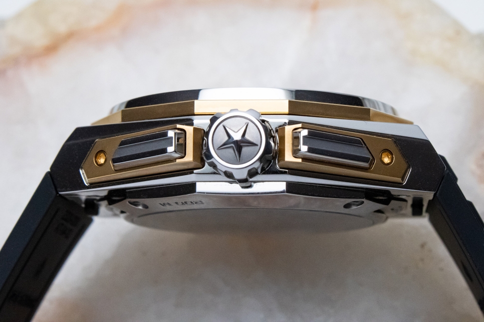 45 мм-корпус из нержавеющей стали и желтого золота с резкими углами в стиле суперкара имеет восьмиугольный силуэт и фирменный многоярусный двенадцатигранный безель Defy. Двухцветная конструкция подчеркивает контраст между двумя материалами, зеркальной полированной и сатинированной отделкой. Задняя крышка с сапфировым стеклом обеспечивает 200-метровую водонепроницаемость.
