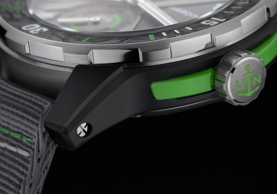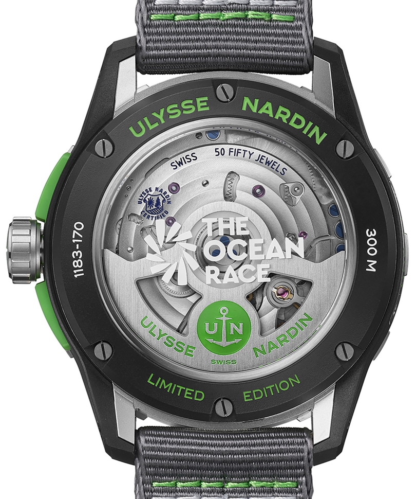 Часы оснащены мануфактурным автоматическим калибром UN-118. Благодаря высокотехнологичному спусковому механизму с компонентами из кремния и алмазной обработкой DIAMonSIL, механизм обеспечивает высокую производительность и 60-часовой запас хода. Украшен отделкой с круговым узором Côtes de Genève на мостах, воронеными винтами по всей длине, перлажем на платине и матовым ротором с вырезами, акцентами лаймово-зеленого цвета, гармонирующими с корпусом. The Ocean Race с возможностью заказа на сайте SwissChrono.ru комплектуются серым текстильным ремешком, полностью изготовленным из рыболовных сетей, с застежкой-липучкой.