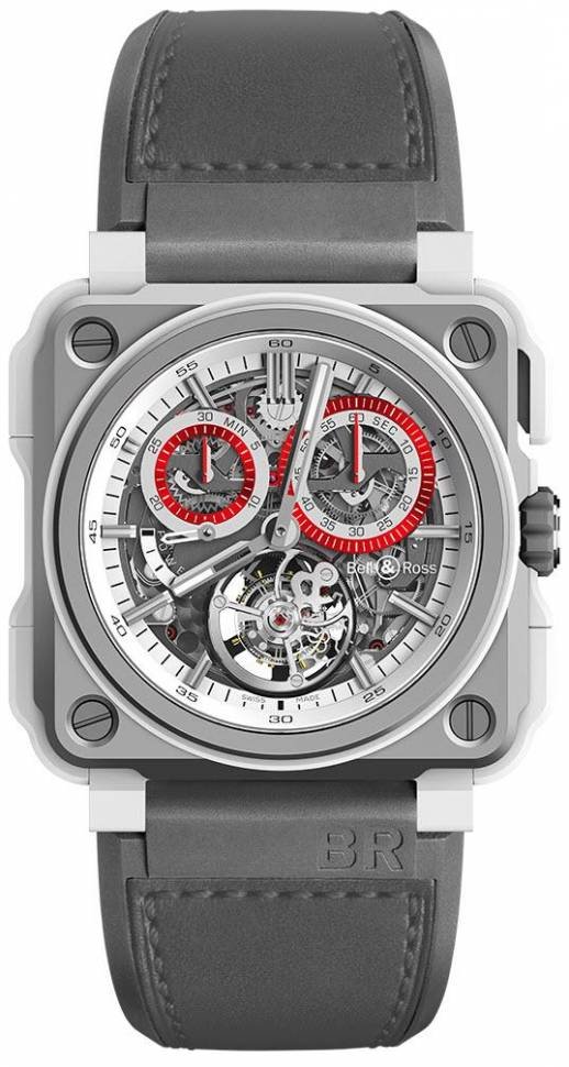 Титановый корпус с микроструйной обработкой покрыт керамической матовой белой «лентой», чтобы избежать отражений света. Для серого корпуса и дисплея выбрали расцветку фюзеляжей самолетов. В новинке через скелетонированный циферблат виден модуль хронографа над механизмом. Только 30-минутный счетчик и наконечник центрального хронографа окрашены в ярко-красный цвет, чтобы повысить удобочитаемость. Толкатели хронографа интегрированы в устройство. У BR-X1 ручной монокристаллический хронограф Tourbillon имеет сложный дизайн. Вместо обычного секундомера в новинке используется уникальный хронограф с Tourbillon. Большинство технических характеристик можно увидеть под сапфировым циферблатом.