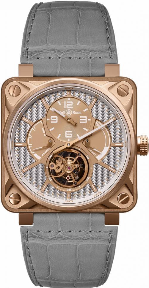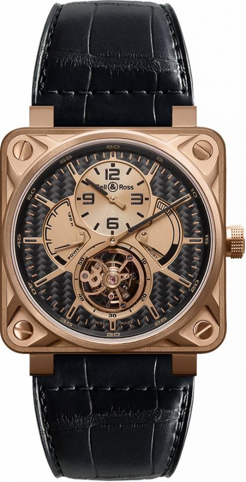 Эксклюзивная версия Tourbillon – это ультра-сложная конструкция, которая сочетает четыре дополнительных функции. Углеродное волокно деталей и набор из алюминиевого волокна калибра BR-CAL.313 на 56 камнях в сочетании с высокотехнологичной архитектурой корпуса оптимизируют устойчивость и легкость новинки роскошного часового производства. Bell & Ross разрабатывает часы похожими на автомобили и самолеты – то, что нравится мужчинам. Индекс доверия указывает период времени, когда часы наиболее точны. Индикатор запаса хода отображает оставшееся время работы. Турбийон гарантирует точность, компенсируя силу тяжести в вертикальном положении. Регулятор разделяет чтение часовых и минутных стрелок. Автоматическая механика со специально открытым движением хронографа и X-образным мостом сверху видимы через сапфировый циферблат. Коллекции является одним из тех шедевров, которые носят с гордостью.