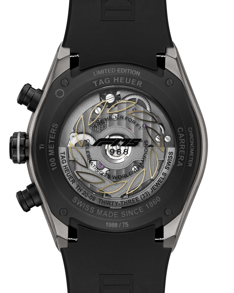 44 мм-корпус часов из титана Grade 2 повторяет дизайн базовой модели Carrera Extreme Sport, с несколькими уникальными элементами, включая безель из 18-каратного желтого золота 3N, тахиметрическую шкалу с логотипом Формулы-1 и прорезью «75» в ознаменование 75-летия спорта, радиальную шлифовку и полировку. Сапфировая задняя крышка увенчана золотым лавровым венком и дополнительным логотипом F1. Гравировка на задней крышке отходит от обычной нумерации ограниченной серии: 75 экземпляров часов пронумерованы не от 1 до 75, а с 1950 по 2025 год, чтобы увековечить каждый сезон в истории Формулы-1. Как и в предыдущих версиях, часы рассчитаны на водонепроницаемость до 100 метров.