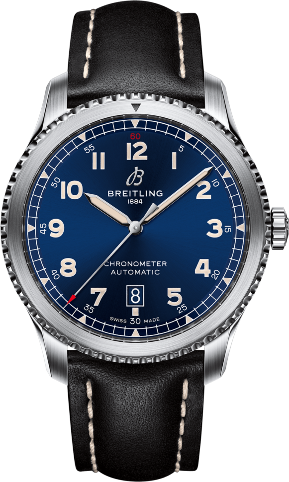 Новые мужские часы Breitling Aviator 8 Automatic 41 полированный корпус из нержавеющей стали с полированными скошенными углами. Черный A17315101B1X4, A17315101B1X2, A17315101B1X1 или синий A17315101C1X4, A17315101C1X2, A17315101C1X1 циферблат декорирован солнечными лучами. На экране расположены светящиеся арабские цифры и часовые метки в виде треугольника, трек минут и секунд с мелким шрифтом. Полированные стрелки дополняет светящаяся заливка.