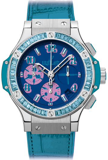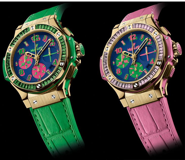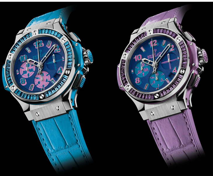 Новая версия часов выполнена в непривычно ярких основных цветах. Hublot прежде отличался сдержанностью и строгостью. Каждый цвет был выпущен ограниченной серией в двести экземпляров. Корпус хронометров может быть украшен аметистами, топазами, зелеными гранатами (цаворитами), сапфирами.