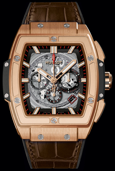 Модель выполнена в необычном дизайне. Корпус часов напоминает бочку. Через прозрачное стекло циферблата просматривается платиновый механизм. Изящество золота Hublot подчеркнул болтами из титана.