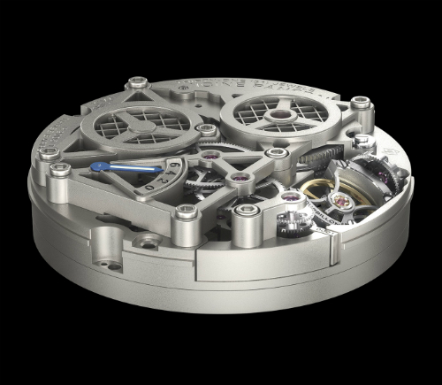 Роль циферблата играет все тот же скелетонизированный механизм на котором удобно разместились часовые индексы. Внимание к себе приковывает счетчик малой секундной стрелки, размещенный в позиции цифры «9». Его индикатор весело вращается вокруг своей оси в один такт с качающимся турбийоном. Другой индикатор, размещенный в позиции тройки, отвечает за показ времени второго часового пояса. Используемый автоматический механизм отвечает всем установленным стандартам, предъявляемым к часам люксового сегмента. Его производительность впечатляет — калибр способен бесперебойно функционировать на протяжении 6 суток. Узнать об оставшемся запасе хода можно с помощью дополнительного индикатора, расположившегося на задней крышке часов.