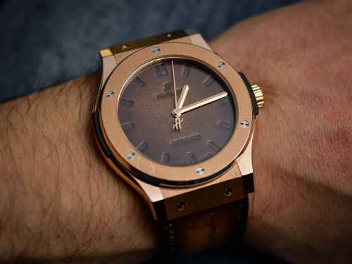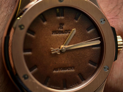 Произвести ремешок из такой кожи, а также стилизовать коробку для часов под обувную — это неплохие, однако слишком простые решения. А как вам идея, чтобы выполнить из кожи весь циферблат? Получилось бы довольно здорово, не правда ли? Именно эта идея легла в основу дизайна нового аксессуара Classic Fusion Berluti. На деле воплотить эту задумку оказалось не так просто, как могло показаться на первый взгляд. Дело в том, что натуральная кожа не может похвастаться высокой устойчивостью к воздействиям ультрафиолетового излучения, а также воды. Использовать натуральный материал в герметичном корпусе — задача не из легких, однако с ней в компании Hublot справились. По заверениям ее официальных представителей циферблат аксессуара достойно прошел все те испытания, которые проходят все его аналоги, выполненные из традиционных материалов. Несложно догадаться, что зернистая кожа циферблата с теплым оттенком патины и табака была произведена легендарной компанией Berluti в 2015 году отметившей свой 120-летний юбилей.