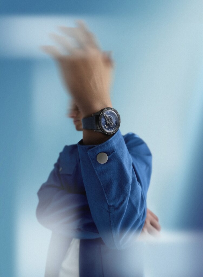 Темно-синяя поверхность циферблата с гравированным узором «солнечные лучи» служит крышкой барабана. Насыщенный цвет индиго с гравированными текстурами дополнен синим цветом кремниевого осциллятора и балансовой пружины. Завершая синюю эстетику, часы поставляются с двумя каучуковыми ремешками: текстурированным сине-черным и двухцветным сине-серым, оснащенными раскладывающейся застежкой из титана с DLC-покрытием и черной керамики.