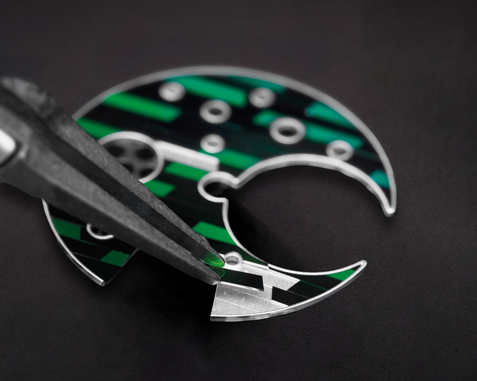Зеленый кремниевый циферблат, изготовленный с использованием техники маркетри, состоит из 103 отдельных кремниевых пластинок, которые вручную собраны в единую мозаику и создают эффект визуальной глубины за счет чередования матовой и полированной отделки. Отдельные компоненты механизма расположены над поверхностью циферблата, что создает эффектный вид и демонстрирует механику без скелетонизации.