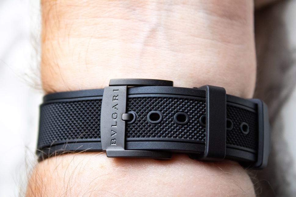 Традиционный круглый циферблат Octo Roma по сравнению с восьмиугольным циферблатом остальной линейки Octo включает арабские цифры на отметках 12 и 6 часов в характерном стиле Bvlgari. Основная поверхность циферблата выполнена в антрацитово-сером цвете с узором Clous de Paris с матовой отделкой. Диск с индикацией времени обрамлен внешним вращающимся кольцом часового пояса с названиями городов и сопутствующей внутренней черно-серой 24-часовой шкалой. Накладные часовые метки, часовая и минутная стрелки покрыты материалом Super-LumiNova (SLN) для свечения в темноте.