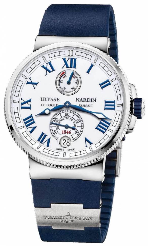 Спортивные по дизайну мужские часы по своим техническим характеристикам ничем не проще классических моделей. Лучшие мастера компании Ulysse Nardin работали над коллекцией Marine для создания образа активной и динамичной личности. Их можно носить и с обычной одеждой, и с деловым костюмом. Корпус часов изготовлен из нержавеющей стали и титана и имеет размер 43 мм. Механизм с автоматическим подзаводом работает от амплитуды движения руки. Часы предназначены для того, чтобы в них плавали и имеют водонепроницаемость 100 м. Циферблат закрыт прозрачным антибликовым стеклом из сапфирового хрусталя высокой прочности, благодаря чему обеспечивается максимальная защита от сколов и механических повреждений. Часы укомплектованы каучуковым ремешком с раскладывающейся застежкой из стали, превосходно дополняющим эксклюзивный образ модели. Хронометр. Запас хода до 60 часов.