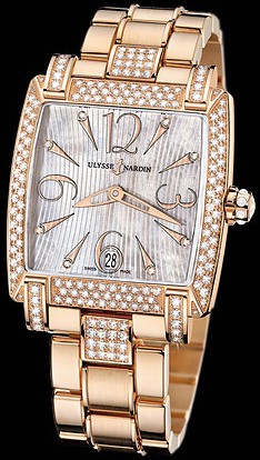Строгость, элегантность, лаконичность, простота и изысканность форм в сочетании с непревзойденным качеством являются основными характеристиками женских наручных часов компании Ulysse Nardin. Инкрустация бриллиантами превращает элегантные часы в изысканное украшение. Часы выполнены в корпусе из розового золота 18 карат размером 34х35,4 мм. Толщина корпуса составляет 9,5 мм. Механический калибр с функцией автоподзавода, который приводит в движение стрелки, собран лучшими мастерами. Эти часы с водонепроницаемостью 50 м позволят вам плавать в бассейне или принимать душ. Циферблат закрыт прозрачным антибликовым стеклом из сапфирового хрусталя высокой прочности, благодаря чему обеспечивается максимальная защита от сколов и механических повреждений. Из сапфирового хрусталя сделана и задняя крышка, которая дает возможность воочию увидеть детали механизма и вносит нотку неординарности. Часы укомплектованы золотым браслетом с раскладывающейся застежкой из золота, превосходно дополняющим эксклюзивный образ модели. Бриллианты 192 шт. Запас хода до 42 часов. Задняя крышка прозрачная.