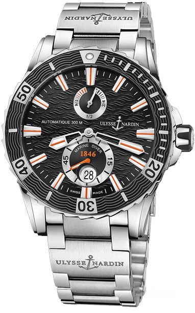 Стильные cпортивные часы от Ulysse Nardin, воплотившие в себе усложненный часовой механизм в сочетании с гармоничным дизайном, превосходно смотрятся на запястье. Даная модель отличается не только своим напористым характером, но и следованием за лучшими часовыми традициями. Изготовленный из нержавеющей стали корпус часов, имеет размер 44 мм. Механизм с автоматическим подзаводом работает от амплитуды движения руки. Эти часы созданы специально для дайвинга, они могут выдерживать глубинное давление воды и обладают водонепроницаемостью в 300 м. Циферблат закрыт прозрачным антибликовым стеклом из сапфирового хрусталя высокой прочности, благодаря чему обеспечивается максимальная защита от сколов и механических повреждений. Браслет из нержавеющей стали с раскладывающейся стальной застежкой превосходно дополняет изысканный образ модели. Запас хода до 42 часов.