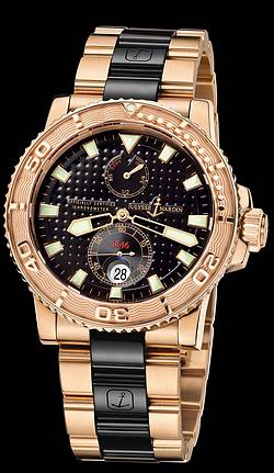 Представленные мужские часы, выполненные в спортивном стиле, превосходно сочетают в себе идеально созданный дизайн и современное техническое оснащение. Эта модель, разработанная фирмой Ulysse Nardin, отличается своим напористым мужским характером. Модель поставляется в золотом корпусе размером 42,7 мм. Механизм с автоматическим подзаводом работает от амплитуды движения руки. Часы предназначены для того, чтобы в них плавали и имеют водонепроницаемость 200 м. Циферблат закрыт прозрачным антибликовым стеклом из сапфирового хрусталя высокой прочности, благодаря чему обеспечивается максимальная защита от сколов и механических повреждений. Модель поставляется на золотом браслете с раскладывающейся золотой застежкой. Запас хода до 42 часа. Браслет со вставками керамики.