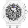 Прогрессивные технологии часов удивительным образом переплетаются с устоявшимся традиционным дизайном модельного ряда Royal Oak Offshore, присущим часам от компании Audemars Piguet. Эта изысканная модель будет превосходно смотреться на запястье. Модель оснащена дополнительным механизмом для индикации времени с помощью звуков - репетиром. Модель поставляется в керамическом корпусе размером 44 мм. Корпус часов толщиной 15,4 мм. Механизм с автоматическим подзаводом работает от амплитуды движения руки. Часы с водонепроницаемостью 20 м перенесут небольшое случайное попадание воды. Циферблат закрыт прозрачным антибликовым стеклом из сапфирового хрусталя высокой прочности, благодаря чему обеспечивается максимальная защита от сколов и механических повреждений. Благодаря прозрачной задней крышке корпуса можно увидеть практически все детали превосходного механизма и получать эстетическое наслаждение, глядя на его слаженную работу. Ремешок выполнен из каучука и комплектуется простой титановой застежкой. Репетир. Вечный календарь. Хронограф. Калибр 2885 на 52 камнях. Запас хода до 45 часов. Циферблат серебристый. Задняя крышка прозрачная.Гарантия и комплектация