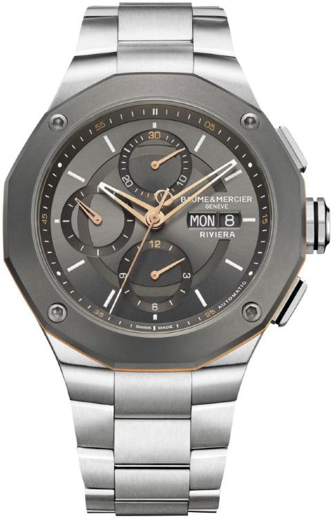 Мужской хронограф от Baume & Mercier представляет собой идеальное сочетание гармоничного дизайна и совершенного технического оснащения. Он идеально подойдет уверенным в себе людям с высоким социальным статусом, которые хотят подчеркнуть свою индивидуальность. Часы произведены в стальном со вставками из титатна корпусе размером 43,06 мм. Толщина часов составляет 14,14 мм. Механизм с автоматическим подзаводом работает от амплитуды движения руки. Часы предназначены для того, чтобы в них плавали и имеют водонепроницаемость 100 м. Циферблат закрыт прозрачным антибликовым стеклом из сапфирового хрусталя высокой прочности, благодаря чему обеспечивается максимальная защита от сколов и механических повреждений. Браслет из нержавеющей стали с раскладывающейся стальной застежкой превосходно дополняет изысканный образ модели. Хронограф. Калибр Valjoux. Запас хода до 48 часов. Циферблат серый. Задняя крышка из сапфирового стекла. В комплект входит дополнительный серый каучуковый ремешок.Гарантия и комплектация