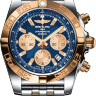 В дизайне и механизме хронографа от Breitling модельного ряда Chronomat соблюдены все современные тенденции часового дела. Он безусловно придется по вкусу любителям скорости и точных измерений. Модель поставляется в стальном со вставками из розового золота корпусе размером 44 мм. Корпус часов толщиной 16,95 мм. Механизм с автоматическим подзаводом работает от амплитуды движения руки. Эти часы созданы специально для дайвинга, они могут выдерживать глубинное давление воды и обладают водонепроницаемостью в 500 м. Циферблат закрыт прозрачным антибликовым стеклом из сапфирового хрусталя высокой прочности, благодаря чему обеспечивается максимальная защита от сколов и механических повреждений. Модель поставляется на стальном браслете с раскладывающейся стальной застежкой. Хронограф. Часы для дайвинга. Калибр Breitling 01. Запас хода до 70 часов. Циферблат синий.Гарантия и комплектация