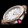 | Дополнение | 12 бриллиантов. Калибр B046. Циферблат белый перламутровый. Заводная головка с розовым камнем и бриллиантом. |
