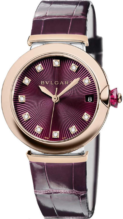 Строгость, элегантность, лаконичность, простота и изысканность форм в сочетании с непревзойденным качеством являются основными характеристиками женских наручных часов компании Bvlgari. Часы произведены в стальном со вставками из розового золота корпусе размером 36 мм. Механизм с автоматическим подзаводом работает от амплитуды движения руки. Часы с водонепроницаемостью 30 м перенесут небольшое случайное попадание воды. Циферблат закрыт прозрачным антибликовым стеклом из сапфирового хрусталя высокой прочности, благодаря чему обеспечивается максимальная защита от сколов и механических повреждений. Ремешок, изготовленный из кожи аллигатора с простой застежкой из стали, выполнен в строгом стиле и воплощает элегантность. 11 бриллиантов. Циферблат фиолетовый. Заводная головка с розовым камнем и бриллиантом.Гарантия и комплектация