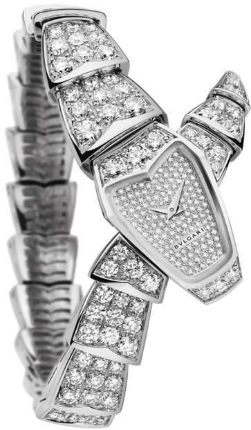 Прогрессивные технологии женских часов удивительным образом переплетаются с устоявшимся традиционным дизайном модельного ряда Serpenti, присущим часам от компании Bvlgari. Инкрустация бриллиантами превращает элегантные часы в изысканное украшение. Изготовленный из белого золота 18 карат корпус часов, имеет размер 26 мм. Высокоточный надежный кварцевый механизм не нуждается в подзаводке. Часы с водонепроницаемостью 30 м перенесут небольшое случайное попадание воды. Циферблат закрыт прозрачным антибликовым стеклом из сапфирового хрусталя высокой прочности, благодаря чему обеспечивается максимальная защита от сколов и механических повреждений. Часы укомплектованы золотым браслетом. Бриллианты на корпусе, циферблате, браслете. Циферблат со снежным паве.Гарантия и комплектация