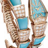 Прогрессивные технологии женских часов удивительным образом переплетаются с устоявшимся традиционным дизайном модельного ряда Serpenti, присущим часам от компании Bvlgari. Инкрустация бриллиантами превращает элегантные часы в изысканное украшение. Часы произведены в золотом корпусе размером 26 мм. Высокоточный надежный кварцевый механизм не нуждается в подзаводке. Часы с водонепроницаемостью 30 м перенесут небольшое случайное попадание воды. Циферблат закрыт прозрачным антибликовым стеклом из сапфирового хрусталя высокой прочности, благодаря чему обеспечивается максимальная защита от сколов и механических повреждений. Часы укомплектованы золотым браслетом. Бриллианты на корпусе, циферблате, браслете. Калибр BO33. Элементы из бирюзы на браслете. Циферблат бирюзовый лакированный.Гарантия и комплектация