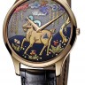 Дизайнерская модель часов от Chopard, созданная для изящных запястий прекрасных женщин, является настоящим эталоном часового искусства. Представленная серия гармонично объединила в своем корпусе (18-каратное розовое золото) круглой формы, безупречно созданный дизайн, с нотками креативного подхода, а также передовые часовые разработки. Оригинальности и эксклюзивности придает композиции изображение козы на циферблате – символ китайского гороскопа. Сдержанную элегантность аксессуара идеально подчеркивает утонченный золотой безель. Центральная часть циферблата этой ультратонкой модели украшена золотыми стрелками, отвечающими за индикацию времени. Циферблат данного творческого шедевра скрыт под прозрачным сапфировым стеклом высокой прочности. Тыльная сторона часов также исполнена из сапфирового хрусталя, благодаря этому открыт обзор на работу часового механизма калибром L.U.C 96.17-L, с 65-часовым запасом хода. Дополняют шикарный аксессуар ремешок из крокодиловой кожи и золотая застежка.Гарантия и комплектация