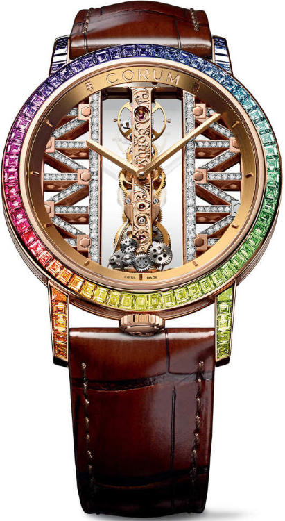 Использование высокотехнологичной механики и совершенных форм является неотъемлемым атрибутом легендарной серии Golden Bridge от Corum. Эти женские часы идеально подойдут уверенным в себе людям с высоким социальным статусом. Инкрустация бриллиантами превращает элегантные часы в изысканное украшение. Часы модели B113/03335-113.991.85/0F02 GG85R выпущены ограниченным количеством экземпляров. Корпус часов изготовлен из розового золота 18 карат и имеет размер 43 мм. Толщина корпуса часов составляет 9,1 мм. Механизм часов с ручным подзаводом от элегантной заводной головки. Часы с водонепроницаемостью 30 м перенесут небольшое случайное попадание воды. Циферблат закрыт прозрачным антибликовым стеклом из сапфирового хрусталя высокой прочности, благодаря чему обеспечивается максимальная защита от сколов и механических повреждений. Ремешок выполнен из кожи аллигатора и комплектуется раскладывающейся золотой застежкой. Ограниченная серия (Limited edition) 18 шт. 68 сапфиров багетной огранки 4,50 карата. 15 перидотов багетной огранки 0,99 карата. 8 цаворитов багетной огранки 1,04 карата. 5 рубинов багетной огранки 0,65 карата. 108 бриллиантов 0,5 карата. Скелетон. Калибр CO 113. Запас хода до 40 часов. Циферблат с микроструктурой из золота № 5 с золотым покрытием. Прозрачная задняя крышка.Гарантия и комплектация