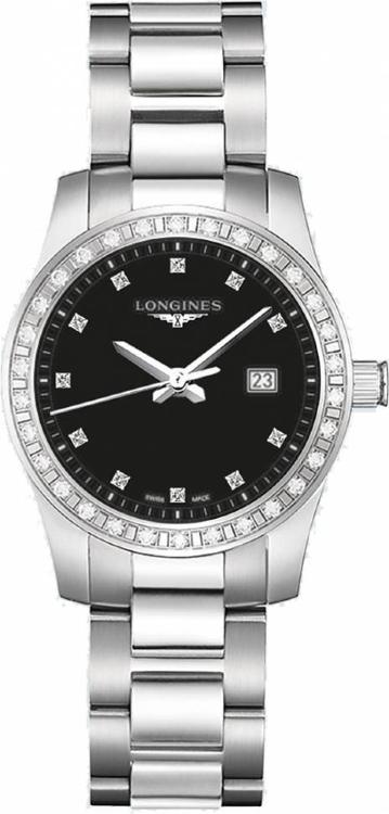 Строгость, элегантность, лаконичность, простота и изысканность форм в сочетании с непревзойденным качеством являются основными характеристиками женских наручных часов компании Longines. Инкрустация бриллиантами превращает элегантные часы в изысканное украшение. Корпус часов изготовлен из нержавеющей стали и имеет размер 34 мм. Высокоточный надежный кварцевый механизм не нуждается в подзаводке. Часы с водонепроницаемостью 30 м перенесут небольшое случайное попадание воды. Циферблат закрыт прозрачным антибликовым стеклом из сапфирового хрусталя высокой прочности, благодаря чему обеспечивается максимальная защита от сколов и механических повреждений. Часы укомплектованы стальным браслетом с раскладывающейся застежкой из стали, превосходно дополняющим эксклюзивный образ модели. Часы с бриллиантами. 50 бриллиантов 0,420 карат на корпусе. 11 бриллиантов на циферблате общим весом 0,036 карат. Калибр L156. Циферблат черный.Гарантия и комплектация
