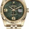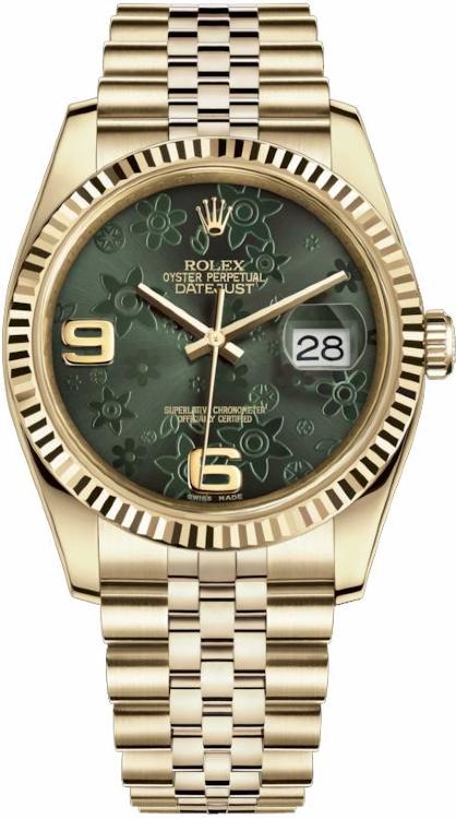 В дизайне и механизме женских часов от Rolex модельного ряда Datejust соблюдены все современные тенденции часового дела. Эта удивительная смесь порождает новый стиль часов, основанный на вековых традициях, получивших современную интерпретацию. Часы выполнены в корпусе из желтого золота 18 карат размером 31 мм. Механизм с автоматическим подзаводом работает от амплитуды движения руки. Часы предназначены для того, чтобы в них плавали и имеют водонепроницаемость 100 м. Циферблат закрыт прозрачным антибликовым стеклом из сапфирового хрусталя высокой прочности, благодаря чему обеспечивается максимальная защита от сколов и механических повреждений. Модель поставляется на золотом браслете с раскладывающейся золотой застежкой. Калибр 3135. Запас хода до 48 часов. Циферблат зеленый.Гарантия и комплектация