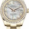 Женские часы серии Datejust, которые выделяются своей элегантностью, неординарностью и представительностью. Они наделены своим неповторимым характером и имеют собственную харизму. Инкрустация бриллиантами превращает элегантные часы в изысканное украшение. Это лучший выбор для тех, кто хочет подчеркнуть свой высокий статус и неординарность. Часы произведены в золотом корпусе размером 31 мм. Механизм с автоматическим подзаводом работает от амплитуды движения руки. Часы предназначены для того, чтобы в них плавали и имеют водонепроницаемость 100 м. Циферблат закрыт прозрачным антибликовым стеклом из сапфирового хрусталя высокой прочности, благодаря чему обеспечивается максимальная защита от сколов и механических повреждений. Браслет выполнен из желтого золота и комплектуется раскладывающейся золотой застежкой. Бриллианты. Калибр 2235. Запас хода до 48 часов. Циферблат белый перламутровый.Гарантия и комплектация