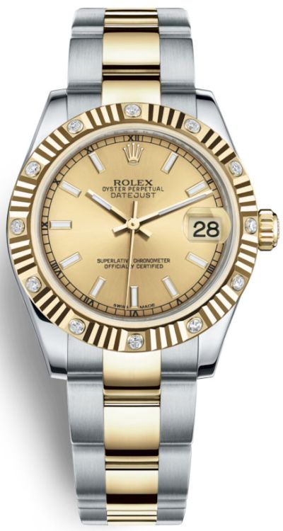 Модель женских наручных часов компании Rolex является эталоном эстетического совершенства и высоких стандартов. Инкрустация бриллиантами превращает элегантные часы в изысканное украшение. Классическое решение в дизайне выгодно подчеркивает силу, уверенность и отменный вкус их обладателя. Часы произведены в стальном со вставками из желтого золота корпусе размером 31 мм. Механизм с автоматическим подзаводом работает от амплитуды движения руки. Часы предназначены для того, чтобы в них плавали и имеют водонепроницаемость 100 м. Циферблат закрыт прозрачным антибликовым стеклом из сапфирового хрусталя высокой прочности, благодаря чему обеспечивается максимальная защита от сколов и механических повреждений. Модель поставляется на стальном браслете с раскладывающейся стальной застежкой. Бриллианты 12 шт. Калибр 2235. Запас хода до 48 часов. Циферблат цвета шампанского.Гарантия и комплектация