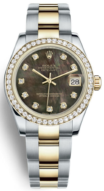 Уникальные, потрясающие женские часы от Rolex коллекции Datejust станут настоящим подарком для истинных поклонников классики и традиций, которые прошли сквозь десятилетия. Инкрустация бриллиантами превращает элегантные часы в изысканное украшение и они гармонично дополнят образ своего обладателя и подчеркнут его индивидуальность и изысканный вкус. Корпус часов изготовлен из нержавеющей стали и желтого золота и имеет размер 31 мм. Механизм с автоматическим подзаводом работает от амплитуды движения руки. Часы предназначены для того, чтобы в них плавали и имеют водонепроницаемость 100 м. Циферблат закрыт прозрачным антибликовым стеклом из сапфирового хрусталя высокой прочности, благодаря чему обеспечивается максимальная защита от сколов и механических повреждений. Часы укомплектованы стальным браслетом с раскладывающейся застежкой из стали, превосходно дополняющим эксклюзивный образ модели. Бриллианты. Калибр 2235. Запас хода до 48 часов. Циферблат черный перламутровый.Гарантия и комплектация