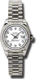 Прогрессивные технологии женских часов удивительным образом переплетаются с устоявшимся традиционным дизайном модельного ряда, присущим часам от компании Rolex. Инкрустация бриллиантами превращает элегантные часы в изысканное украшение. Часы выполнены в корпусе из белого золота 18 карат размером 26 мм. Толщина корпуса составляет 10 мм. Механизм с автоматическим подзаводом работает от амплитуды движения руки. Часы предназначены для того, чтобы в них плавали и имеют водонепроницаемость 100 м. Циферблат закрыт прозрачным антибликовым стеклом из сапфирового хрусталя высокой прочности, благодаря чему обеспечивается максимальная защита от сколов и механических повреждений. Часы укомплектованы золотым браслетом с раскладывающейся застежкой из золота, превосходно дополняющим эксклюзивный образ модели. Бриллианты 10 шт. Запас хода до 42 часов.Гарантия и комплектация