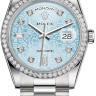 Модель идеально подходит для женщин, которые ценят свой неповторимый стиль и являются поклонниками эксклюзивных вещей. Никто не останется равнодушным при виде часов из коллекции Day-Date от мирового производителя часов Rolex, каждая деталь которых поражает своим качеством. Инкрустация бриллиантами превращает элегантные часы в изысканное украшение Модель поставляется в платиновом корпусе размером 36 мм. Механизм с автоматическим подзаводом работает от амплитуды движения руки. Часы предназначены для того, чтобы в них плавали и имеют водонепроницаемость 100 м. Циферблат закрыт прозрачным антибликовым стеклом из сапфирового хрусталя высокой прочности, благодаря чему обеспечивается максимальная защита от сколов и механических повреждений. Браслет выполнен из платины и комплектуется раскладывающейся платиновой застежкой. 2 багетных и 58 простых бриллиантов. Калибр 3155. Запас хода до 48 часов. Циферблат голубой лед юбилейный дизайн.Гарантия и комплектация