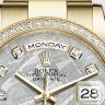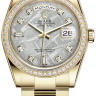 В дизайне и механизме женских часов от Rolex модельного ряда Day-Date соблюдены все современные тенденции часового дела. Инкрустация бриллиантами превращает элегантные часы в изысканное украшение. Эта удивительная смесь порождает новый стиль часов, основанный на вековых традициях, получивших современную интерпретацию. Корпус часов изготовлен из желтого золота 18 карат и имеет размер 36 мм. Механизм с автоматическим подзаводом работает от амплитуды движения руки. Часы предназначены для того, чтобы в них плавали и имеют водонепроницаемость 100 м. Циферблат закрыт прозрачным антибликовым стеклом из сапфирового хрусталя высокой прочности, благодаря чему обеспечивается максимальная защита от сколов и механических повреждений. Браслет выполнен из желтого золота и комплектуется раскладывающейся золотой застежкой. 52 бриллианта на корпусе. 2 багетных и 8 простых бриллиантов на циферблате. Калибр 3155. Запас хода до 48 часов. Циферблат цвета метеорит.Гарантия и комплектация