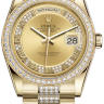 Модель женских наручных часов компании Rolex является эталоном эстетического совершенства и высоких стандартов. Инкрустация бриллиантами превращает элегантные часы в изысканное украшение. Классическое решение в дизайне выгодно подчеркивает силу, уверенность и отменный вкус их обладателя. Модель поставляется в золотом корпусе размером 36 мм. Механизм с автоматическим подзаводом работает от амплитуды движения руки. Часы предназначены для того, чтобы в них плавали и имеют водонепроницаемость 100 м. Циферблат закрыт прозрачным антибликовым стеклом из сапфирового хрусталя высокой прочности, благодаря чему обеспечивается максимальная защита от сколов и механических повреждений. Часы укомплектованы золотым браслетом с раскладывающейся застежкой из золота, превосходно дополняющим эксклюзивный образ модели. Бриллианты на корпусе, браслете. Калибр 3155. Запас хода до 48 часов. Золотистый циферблат частично выложен бриллиантами.Гарантия и комплектация