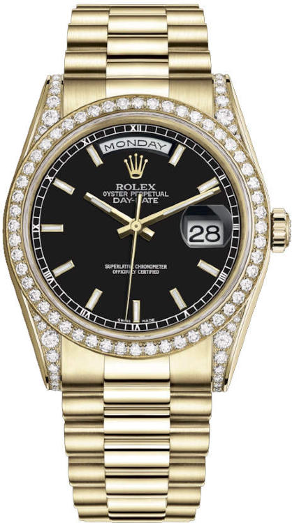 Часы классического дизайна от Rolex для стильных женщин. Индивидуальность данной модели определяет статус своего обладателя и часы становятся неотъемлемой составляющей образа современного человека. Инкрустация бриллиантами превращает элегантные часы в изысканное украшение. Это лучший выбор для тех, кто хочет подчеркнуть свой высокий статус и неординарность. Изготовленный из желтого золота 18 карат корпус часов, имеет размер 36 мм. Механизм с автоматическим подзаводом работает от амплитуды движения руки. Часы предназначены для того, чтобы в них плавали и имеют водонепроницаемость 100 м. Циферблат закрыт прозрачным антибликовым стеклом из сапфирового хрусталя высокой прочности, благодаря чему обеспечивается максимальная защита от сколов и механических повреждений. Браслет из желтого золота с раскладывающейся золотой застежкой превосходно дополняет изысканный образ модели. Бриллианты на корпусе. Калибр 3155. Запас хода до 48 часов. Циферблат черный.Гарантия и комплектация