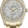 Женские часы серии Day-Date, которые выделяются своей элегантностью, неординарностью и представительностью. Они наделены своим неповторимым характером и имеют собственную харизму. Инкрустация бриллиантами превращает элегантные часы в изысканное украшение. Это лучший выбор для тех, кто хочет подчеркнуть свой высокий статус и неординарность. Изготовленный из желтого золота 18 карат корпус часов, имеет размер 36 мм. Механизм с автоматическим подзаводом работает от амплитуды движения руки. Часы предназначены для того, чтобы в них плавали и имеют водонепроницаемость 100 м. Циферблат закрыт прозрачным антибликовым стеклом из сапфирового хрусталя высокой прочности, благодаря чему обеспечивается максимальная защита от сколов и механических повреждений. Часы укомплектованы золотым браслетом с раскладывающейся застежкой из золота, превосходно дополняющим эксклюзивный образ модели. Бриллианты на корпусе. 2 багетных и 8 обычных бриллиантов на циферблате. Калибр 3155. Запас хода до 48 часов. Циферблат цвета метеорит.Гарантия и комплектация