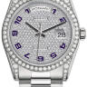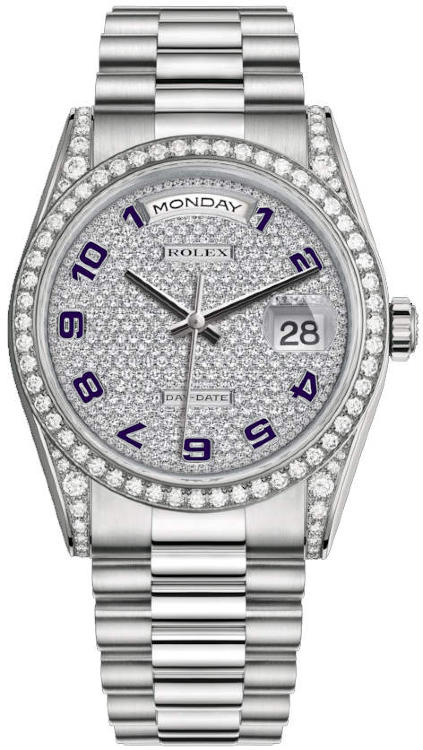 Коллекция Day-Date элегантных женских часов от Rolex поражает своим разнообразием, роскошью и функциональностью. Инкрустация бриллиантами превращает элегантные часы в изысканное украшение. Изготовленный из белого золота 18 карат корпус часов, имеет размер 36 мм. Механизм с автоматическим подзаводом работает от амплитуды движения руки. Часы предназначены для того, чтобы в них плавали и имеют водонепроницаемость 100 м. Циферблат закрыт прозрачным антибликовым стеклом из сапфирового хрусталя высокой прочности, благодаря чему обеспечивается максимальная защита от сколов и механических повреждений. Часы укомплектованы золотым браслетом с раскладывающейся застежкой из золота, превосходно дополняющим эксклюзивный образ модели. Бриллианты на корпусе и циферблате. Калибр 3155. Запас хода до 48 часов. Циферблат выложен алмазами.Гарантия и комплектация