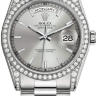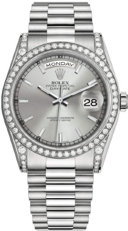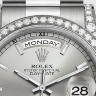 Уникальные, потрясающие женские часы от Rolex коллекции Day-Date станут настоящим подарком для истинных поклонников классики и традиций, которые прошли сквозь десятилетия. Инкрустация бриллиантами превращает элегантные часы в изысканное украшение и они гармонично дополнят образ своего обладателя и подчеркнут его индивидуальность и изысканный вкус. Модель поставляется в золотом корпусе размером 36 мм. Механизм с автоматическим подзаводом работает от амплитуды движения руки. Часы предназначены для того, чтобы в них плавали и имеют водонепроницаемость 100 м. Циферблат закрыт прозрачным антибликовым стеклом из сапфирового хрусталя высокой прочности, благодаря чему обеспечивается максимальная защита от сколов и механических повреждений. Браслет из белого золота с раскладывающейся золотой застежкой превосходно дополняет изысканный образ модели. Бриллианты на корпусе. Калибр 3155. Запас хода до 48 часов. Циферблат серебряный.Гарантия и комплектация