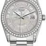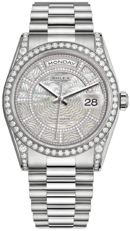 В дизайне и механизме женских часов от Rolex модельного ряда Day-Date соблюдены все современные тенденции часового дела. Инкрустация бриллиантами превращает элегантные часы в изысканное украшение. Эта удивительная смесь порождает новый стиль часов, основанный на вековых традициях, получивших современную интерпретацию. Корпус часов изготовлен из белого золота 18 карат и имеет размер 36 мм. Механизм с автоматическим подзаводом работает от амплитуды движения руки. Часы предназначены для того, чтобы в них плавали и имеют водонепроницаемость 100 м. Циферблат закрыт прозрачным антибликовым стеклом из сапфирового хрусталя высокой прочности, благодаря чему обеспечивается максимальная защита от сколов и механических повреждений. Браслет выполнен из белого золота и комплектуется раскладывающейся золотой застежкой. Бриллианты на корпусе и циферблате. Калибр 3155. Запас хода до 48 часов. Циферблат карусель из белого перламутра.Гарантия и комплектация
