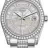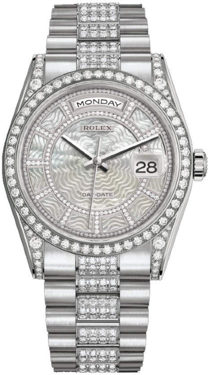 Прогрессивные технологии женских часов удивительным образом переплетаются с устоявшимся традиционным дизайном модельного ряда Day-Date, присущим часам от компании Rolex. Инкрустация бриллиантами превращает элегантные часы в изысканное украшение. Часы выполнены в корпусе из белого золота 18 карат размером 36 мм. Механизм с автоматическим подзаводом работает от амплитуды движения руки. Часы предназначены для того, чтобы в них плавали и имеют водонепроницаемость 100 м. Циферблат закрыт прозрачным антибликовым стеклом из сапфирового хрусталя высокой прочности, благодаря чему обеспечивается максимальная защита от сколов и механических повреждений. Часы укомплектованы золотым браслетом с раскладывающейся застежкой из золота, превосходно дополняющим эксклюзивный образ модели. Бриллианты на корпусе, циферблате, браслете. Калибр 3155. Запас хода до 48 часов. Циферблат карусель из белого перламутра.Гарантия и комплектация
