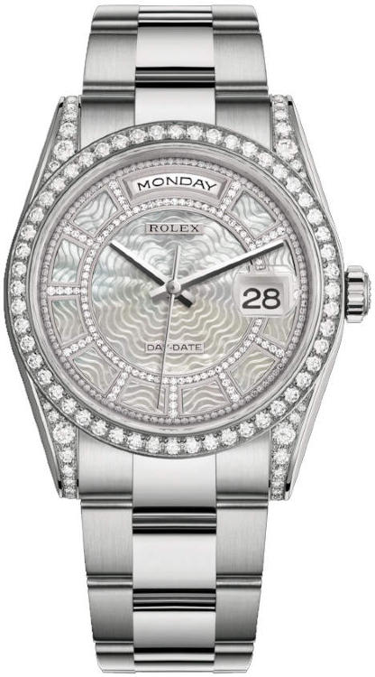 Классика на все времена - женские часы, сдержанные и элегантные по дизайну, разработаны компанией Rolex и адресованы истинным ценителям часового искусства. Модель является образцом представительности, элегантности и неповторимого изысканного стиля. Инкрустация бриллиантами превращает элегантные часы в изысканное украшение. Корпус часов изготовлен из белого золота 18 карат и имеет размер 36 мм. Механизм с автоматическим подзаводом работает от амплитуды движения руки. Часы предназначены для того, чтобы в них плавали и имеют водонепроницаемость 100 м. Циферблат закрыт прозрачным антибликовым стеклом из сапфирового хрусталя высокой прочности, благодаря чему обеспечивается максимальная защита от сколов и механических повреждений. Браслет, изготовленный из белого золота с раскладывающейся застежкой из золота, выполнен в строгом стиле и воплощает элегантность. Бриллианты на корпусе и циферблате. Калибр 3155. Запас хода до 48 часов. Циферблат карусель из белого перламутра.Гарантия и комплектация