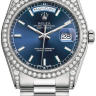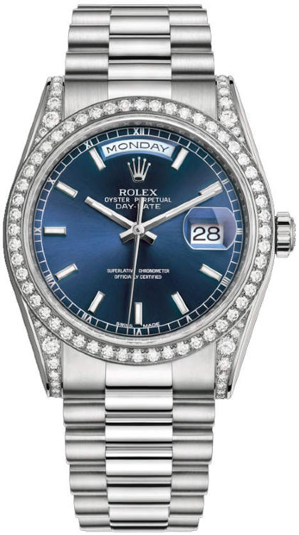 Строгость, элегантность, лаконичность, простота и изысканность форм в сочетании с непревзойденным качеством являются основными характеристиками женских наручных часов компании Rolex. Инкрустация бриллиантами превращает элегантные часы в изысканное украшение. Модель поставляется в золотом корпусе размером 36 мм. Механизм с автоматическим подзаводом работает от амплитуды движения руки. Часы предназначены для того, чтобы в них плавали и имеют водонепроницаемость 100 м. Циферблат закрыт прозрачным антибликовым стеклом из сапфирового хрусталя высокой прочности, благодаря чему обеспечивается максимальная защита от сколов и механических повреждений. Часы укомплектованы золотым браслетом с раскладывающейся застежкой из золота, превосходно дополняющим эксклюзивный образ модели. Бриллианты на корпусе. Калибр 3155. Запас хода до 48 часов. Циферблат синий.Гарантия и комплектация
