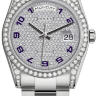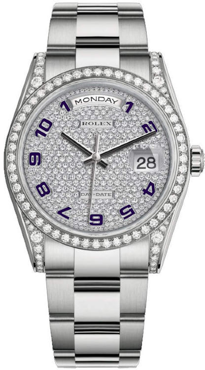 Использование высокотехнологичной механики и совершенных форм является неотъемлемым атрибутом легендарной серии Day-Date от Rolex. Эти женские часы идеально подойдут уверенным в себе людям с высоким социальным статусом. Инкрустация бриллиантами превращает элегантные часы в изысканное украшение. Корпус часов изготовлен из белого золота 18 карат и имеет размер 36 мм. Механизм с автоматическим подзаводом работает от амплитуды движения руки. Часы предназначены для того, чтобы в них плавали и имеют водонепроницаемость 100 м. Циферблат закрыт прозрачным антибликовым стеклом из сапфирового хрусталя высокой прочности, благодаря чему обеспечивается максимальная защита от сколов и механических повреждений. Браслет, изготовленный из белого золота с раскладывающейся застежкой из золота, выполнен в строгом стиле и воплощает элегантность. Бриллианты на корпусе и циферблате. Калибр 3155. Запас хода до 48 часов. Циферблат выложен бриллиантами.Гарантия и комплектация