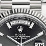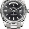 Удобные и, в то же время, стильные часы для мужчин. Популярность классических решений в часовой индустрии обусловлена универсальностью линии Day-Date от Rolex, простотой и представительностью данного стиля. Часы выполнены в корпусе из белого золота 18 карат размером 40 мм. Механизм с автоматическим подзаводом работает от амплитуды движения руки. Часы предназначены для того, чтобы в них плавали и имеют водонепроницаемость 100 м. Циферблат закрыт прозрачным антибликовым стеклом из сапфирового хрусталя высокой прочности, благодаря чему обеспечивается максимальная защита от сколов и механических повреждений. Модель поставляется на золотом браслете с раскладывающейся золотой застежкой. 10 багетных бриллиантов. Калибр 3255. Запас хода до 70 часов. Циферблат черный.Гарантия и комплектация