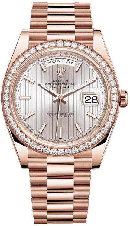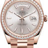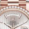 Коллекция Day-Date элегантных женских часов от Rolex поражает своим разнообразием, роскошью и функциональностью. Инкрустация бриллиантами превращает элегантные часы в изысканное украшение. Часы произведены в золотом корпусе размером 40 мм. Механизм с автоматическим подзаводом работает от амплитуды движения руки. Часы предназначены для того, чтобы в них плавали и имеют водонепроницаемость 100 м. Циферблат закрыт прозрачным антибликовым стеклом из сапфирового хрусталя высокой прочности, благодаря чему обеспечивается максимальная защита от сколов и механических повреждений. Браслет выполнен из розового золота и комплектуется раскладывающейся золотой застежкой. 48 бриллиантов на корпусе. Калибр 3255. Запас хода до 70 часов. Циферблат серебристый с тонкими полосками.Гарантия и комплектация