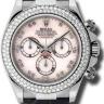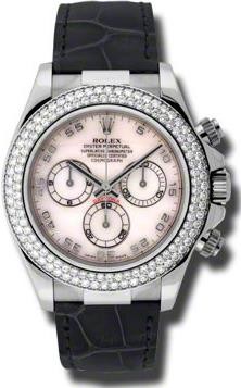 Часы серии представляют собой композицию, объединившую в себе современный смелый дизайн, идеально гармонирующий с лучшими традициями мануфактуры Rolex. Инкрустация бриллиантами превращает элегантные часы в изысканное украшение. Часы выполнены в корпусе из белого золота 18 карат размером 40 мм. Толщина корпуса составляет 11 мм. Механизм с автоматическим подзаводом работает от амплитуды движения руки. Часы предназначены для того, чтобы в них плавали и имеют водонепроницаемость 100 м. Циферблат закрыт прозрачным антибликовым стеклом из сапфирового хрусталя высокой прочности, благодаря чему обеспечивается максимальная защита от сколов и механических повреждений. Модель поставляется на кожаном ремешке с раскладывающейся золотой застежкой. Бриллианты 124 шт. Хронограф. Запас хода до 72 часов.Гарантия и комплектация